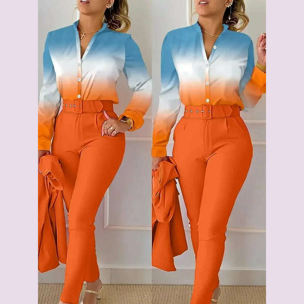 Elegant Women Shirt Two Piece Set Suits Fall New Fashion Print Long Sleeve Top Black Pants Set With Belt Blouses Female Clothing