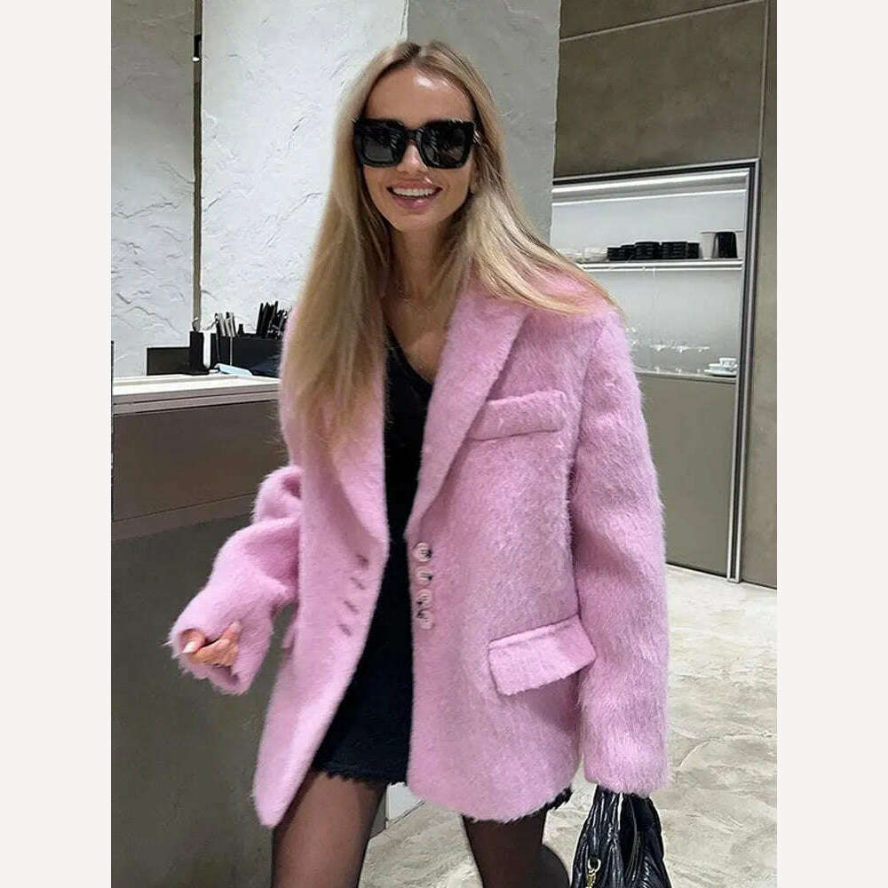 KIMLUD, Pink Lapel Woolen Plush Coats Women Elegant Long Sleeve Button Office Lady Blazer Jacket 2023 Winter Fashion Packet Loose Coat, KIMLUD Womens Clothes