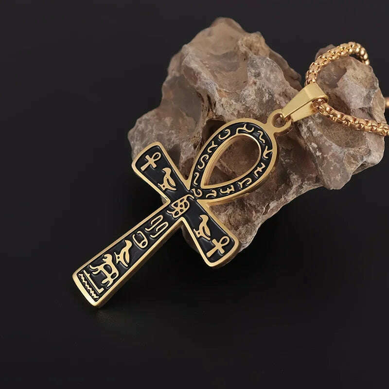 Stainless Steel Ancient Egyptian Ankh Cross Totem Pendant Necklace Men's Pharaoh Life Key Amulet Jewelry - KIMLUD
