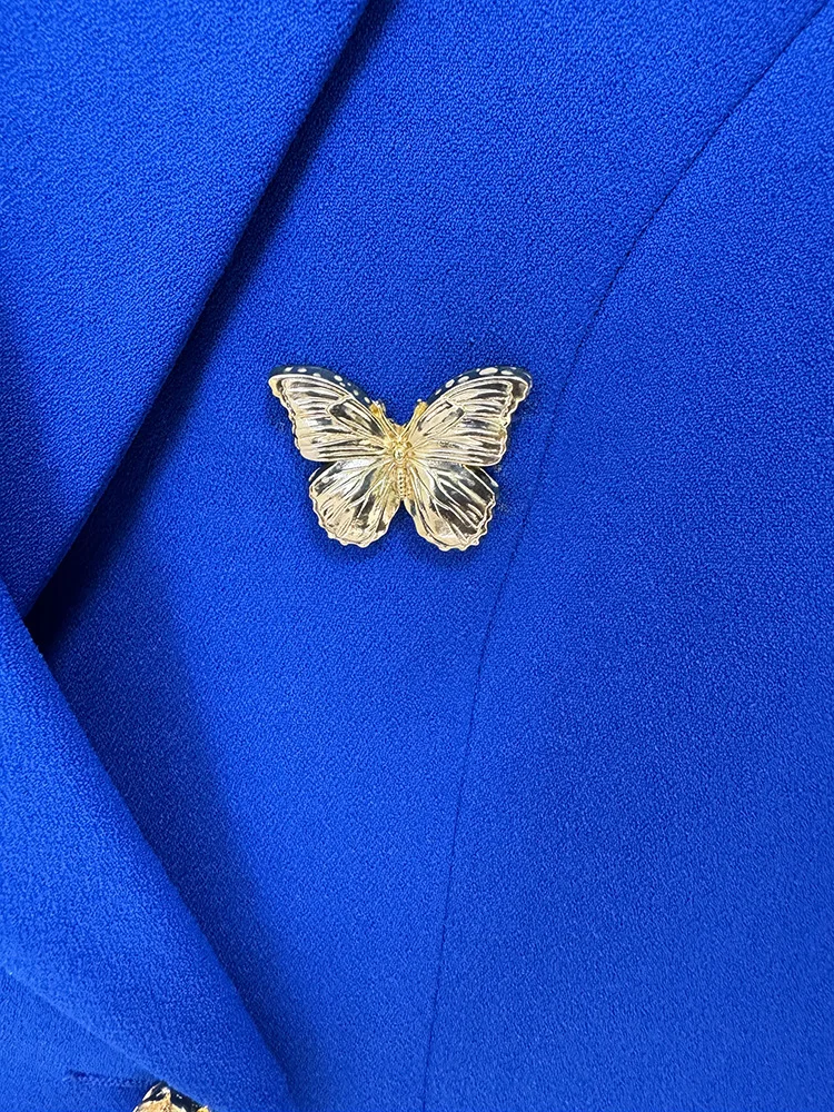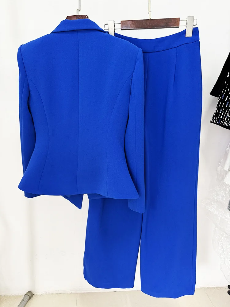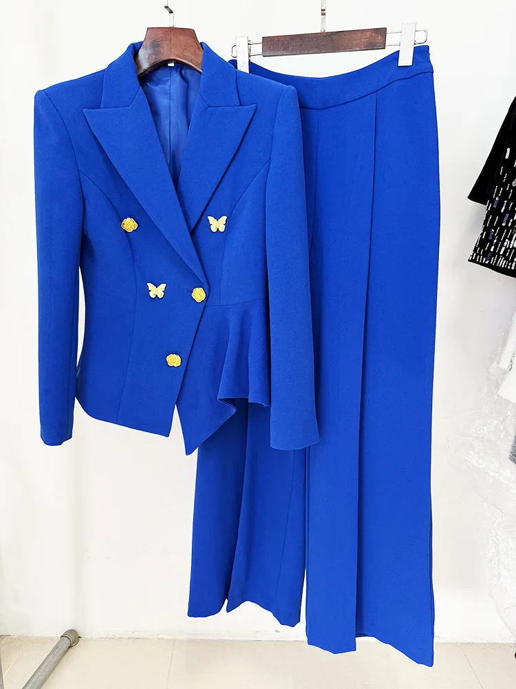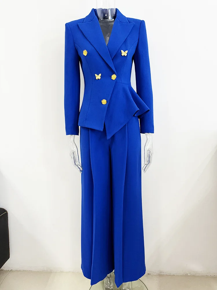 HIGH STREET Newest Fashion 2024 Designer Blazer Suit Women's Rose Buttons Asymmetrical Blazer Straight Pants Set 2pcs