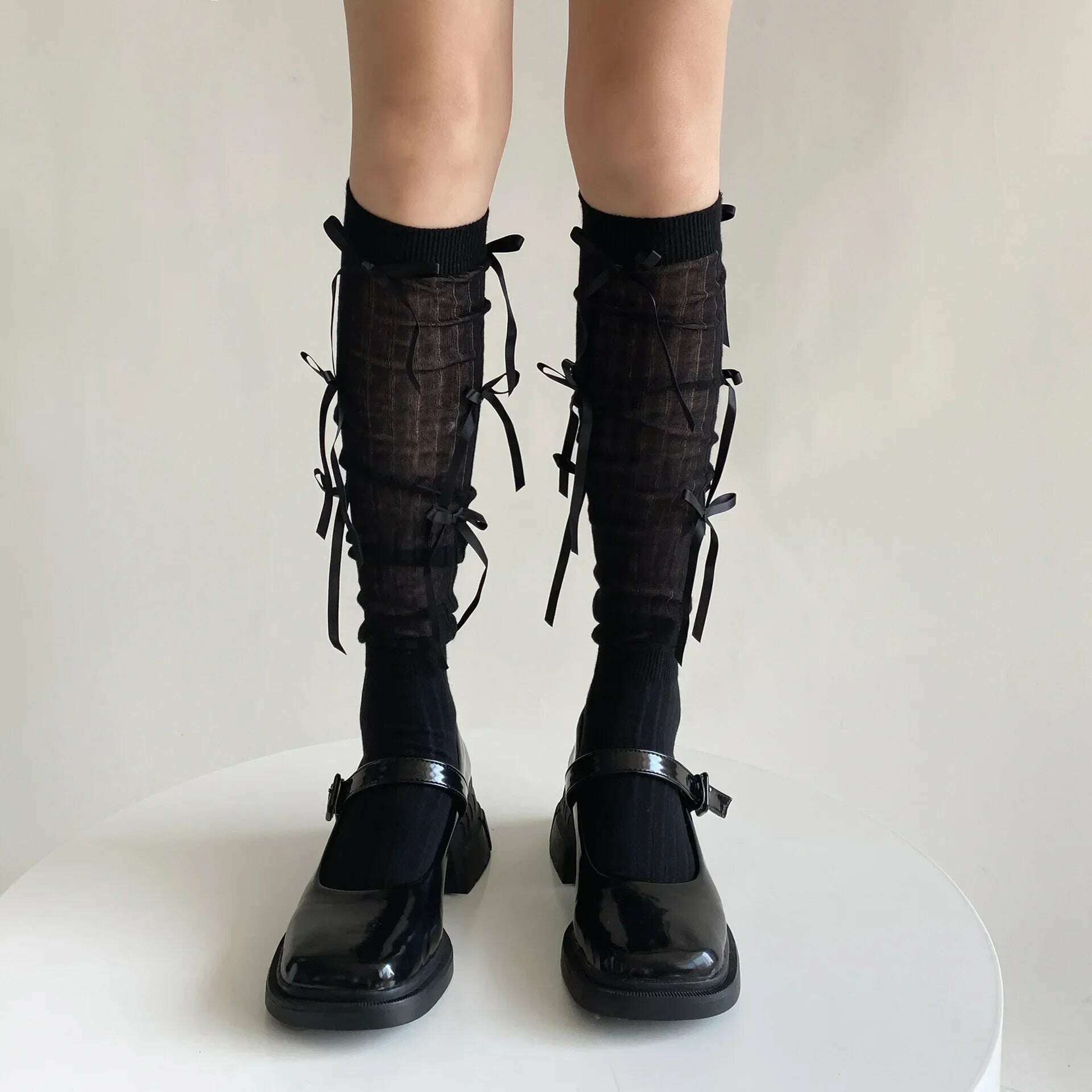 Lolita Long Socks Stockings Women JK Sweet Girls Kawaii Knee High Socks Ballet Style Bandage Bowknot Thigh High Socks Stockings