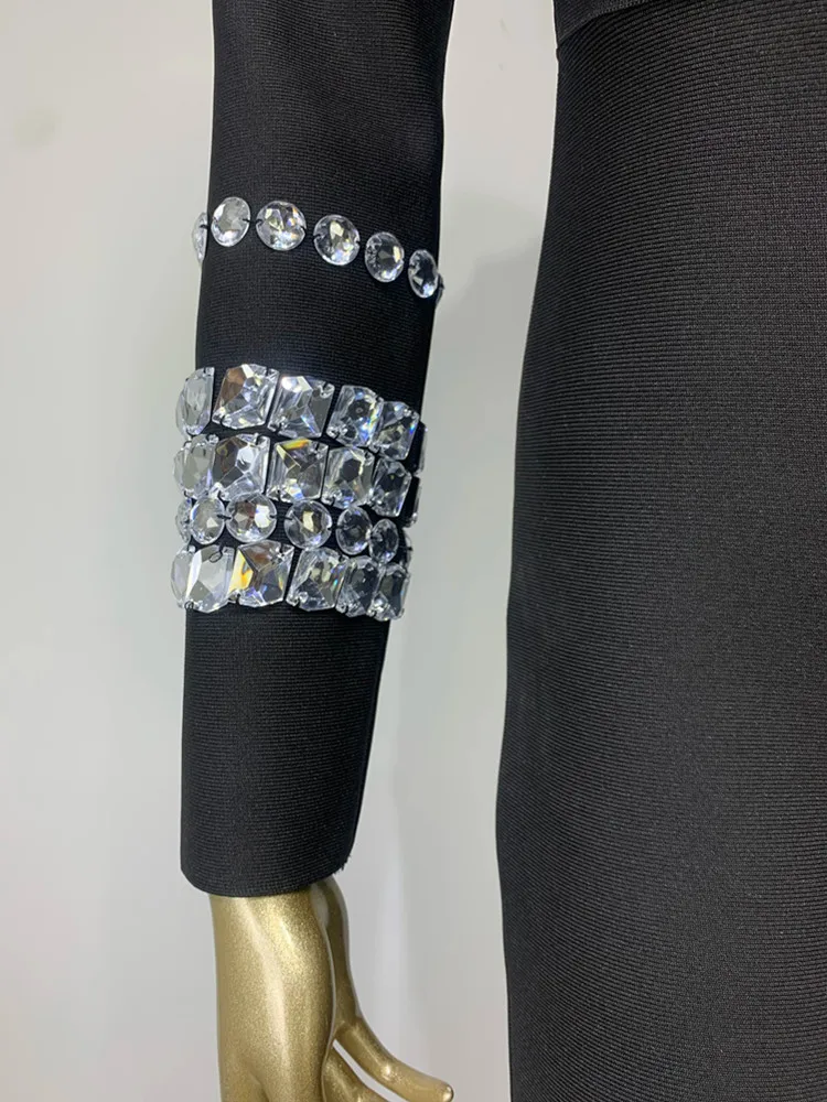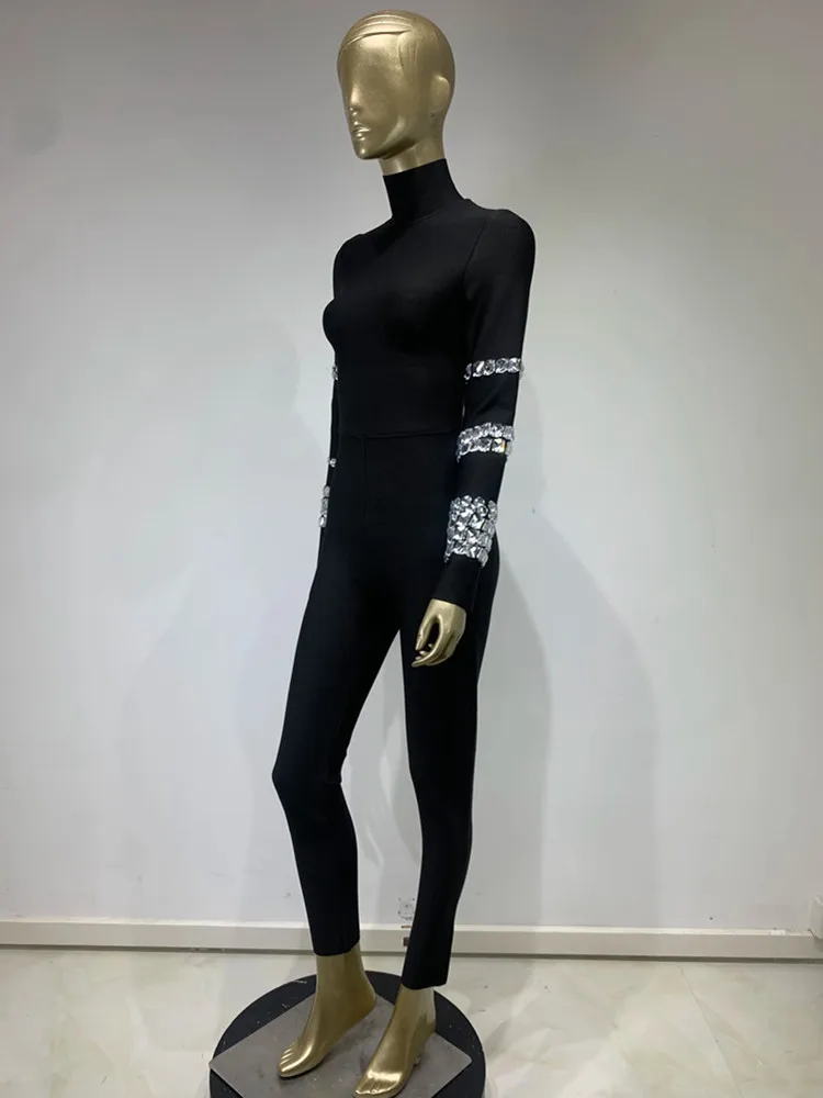 New Women Summer Sexy Long Sleeve Beading Black Bodycon Bandage Jumpsuit 2024 Celebrity Designer High Street Rompers