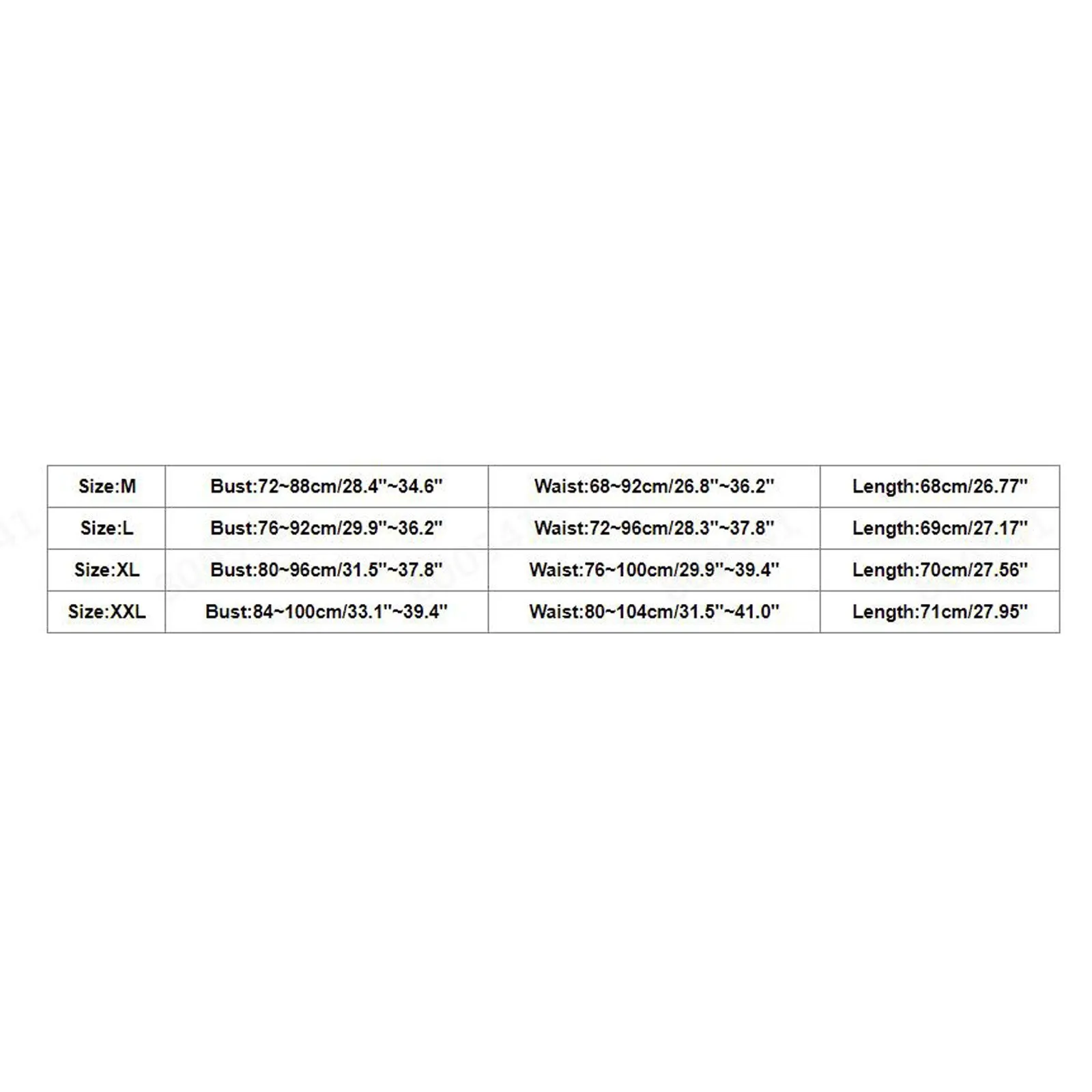 | Size:XL | US Size:8 | UK Size:12 | EU Size:38 | Bust:80-96cm/31.50-37.80'' | Waist:76-100cm/29.92-39.37'' | Length:70cm/27.56'' |