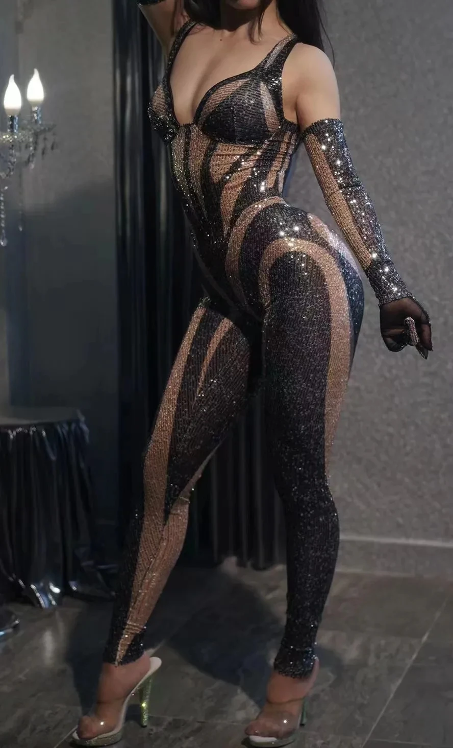 Sexy Sequins Jumpsuit Gloves Sexy Birthday Party Nightclub Outfit Dancer Show Rompers Stage Wear Performance Dance Costume