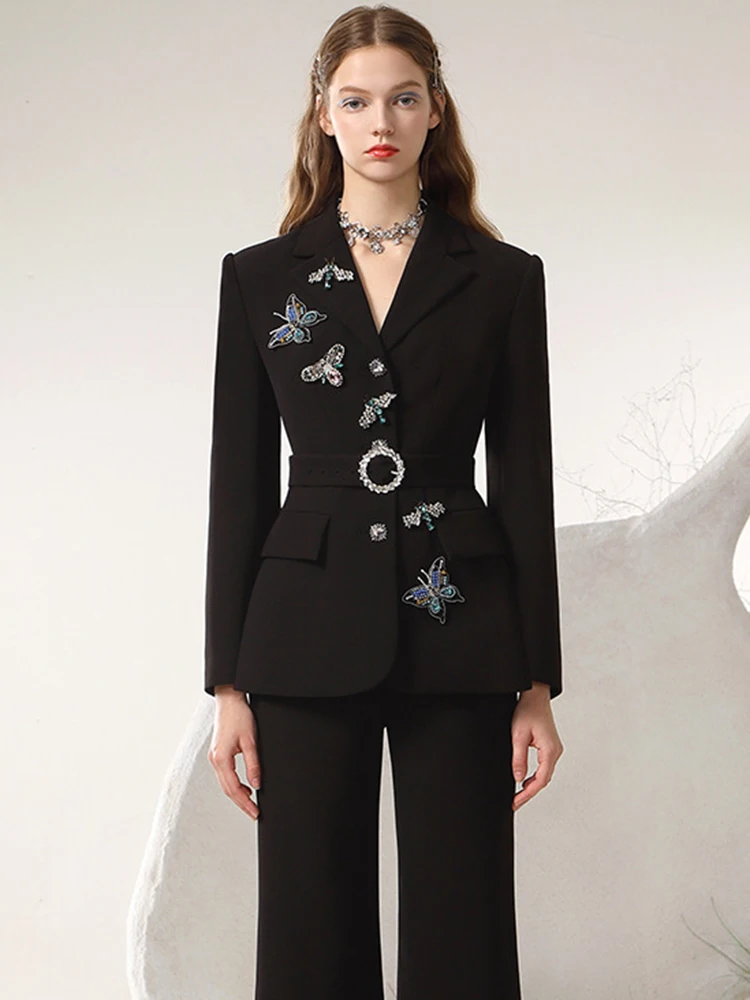 VGH Casual Two Piece Set For Women Notched Collar Spliced Bufferfly Blazers High Waist Flare Pants Slimming Sets Female Fashion