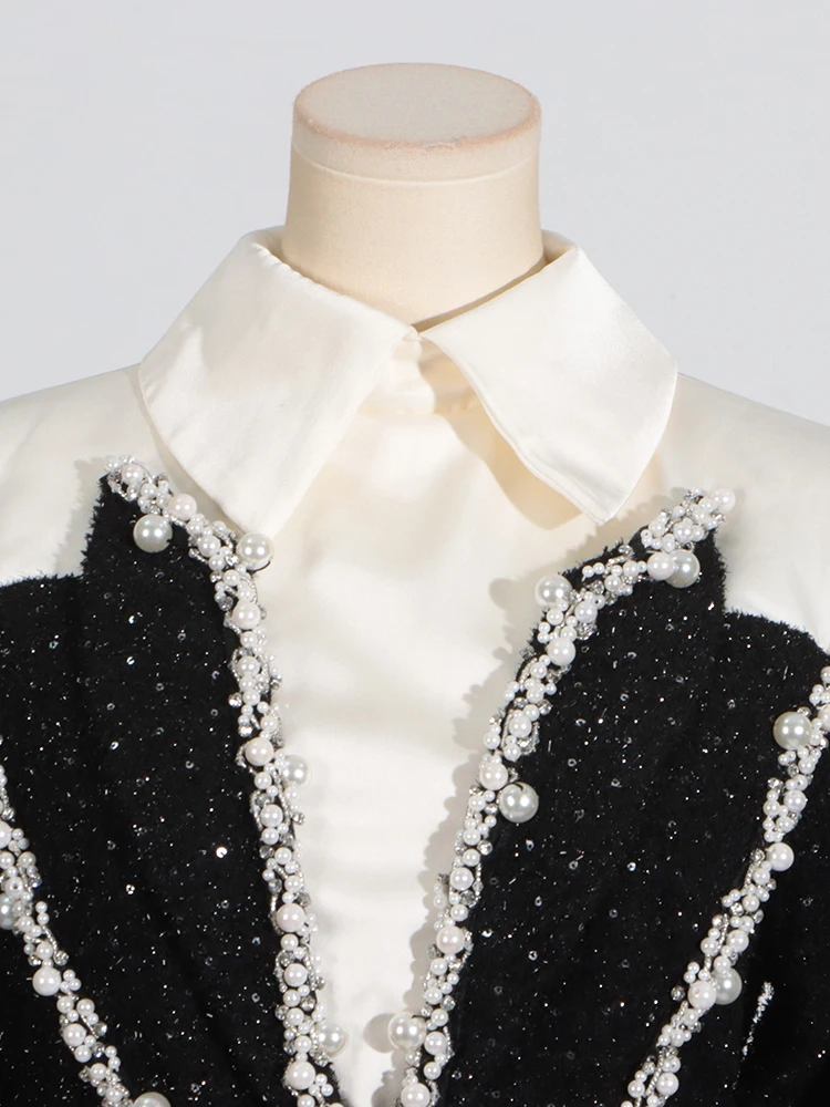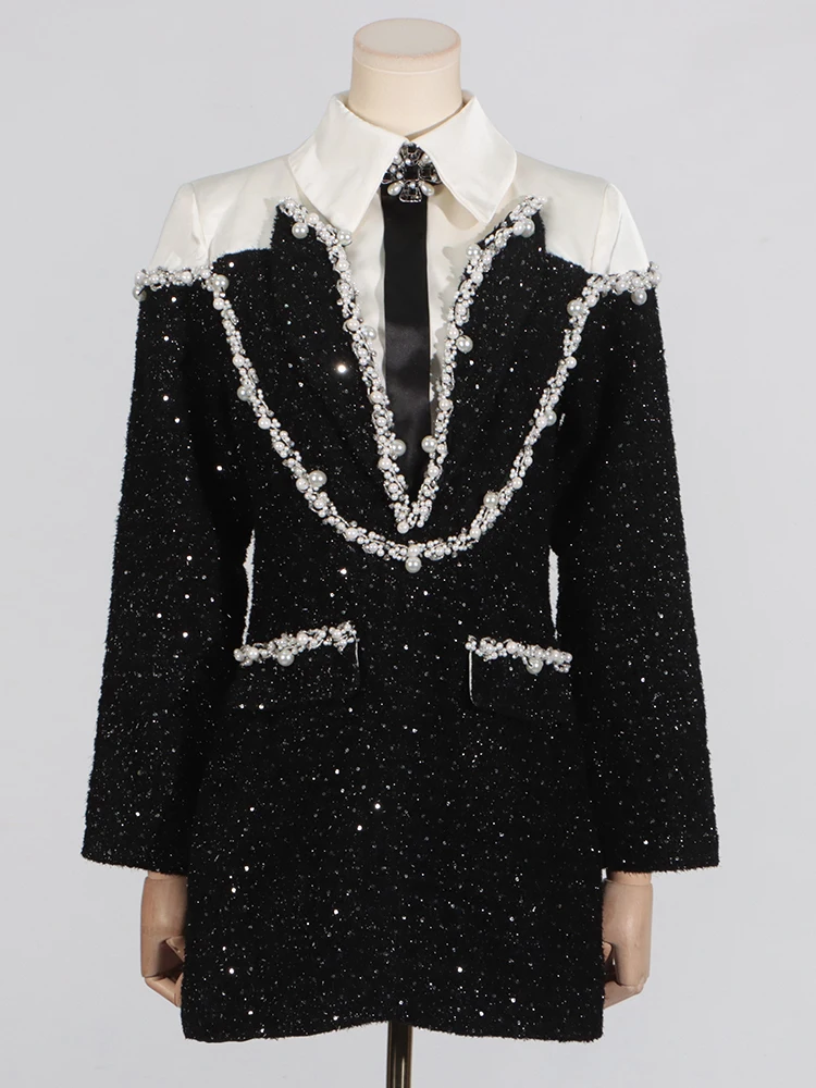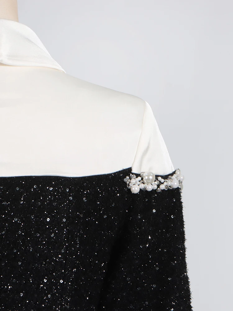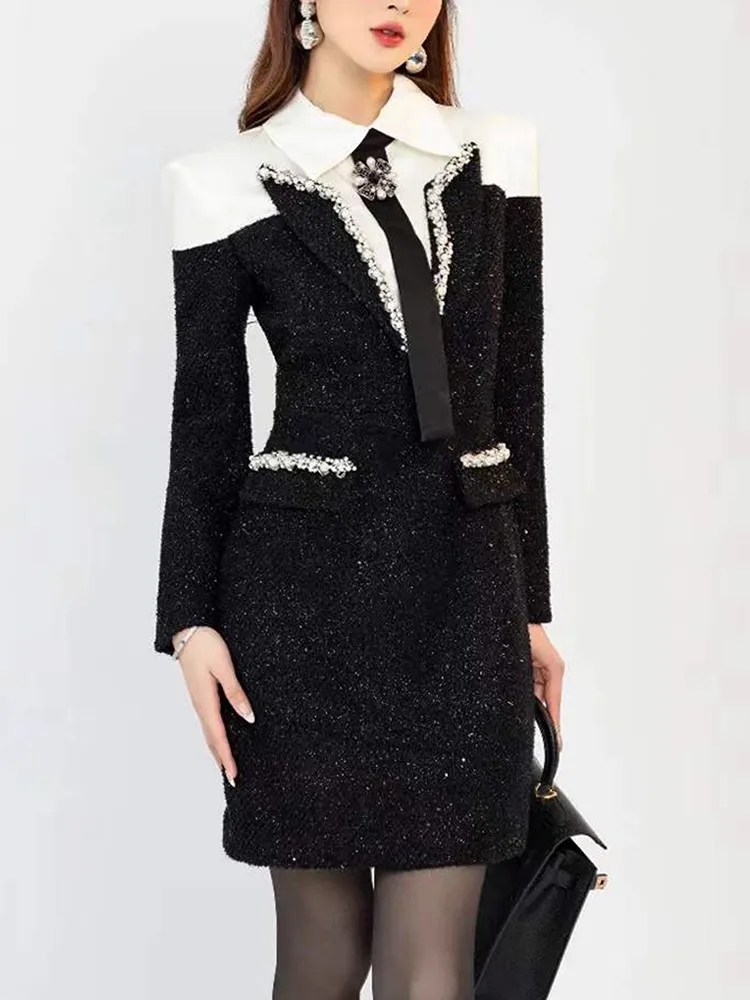 VGH Hit Color Patchwork Diamonds Temperament Dress For Women Lapel Long Sleeve Spliced Lace Up Elegant Dresses Female Fashion