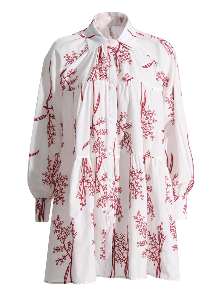 VGH Hit Color Spliced Embroidery Mini Dress For Women Lapel Collar Lantern Sleeve Patchwork Single Breasted Dresses Female New