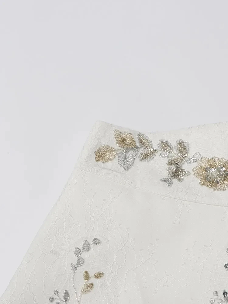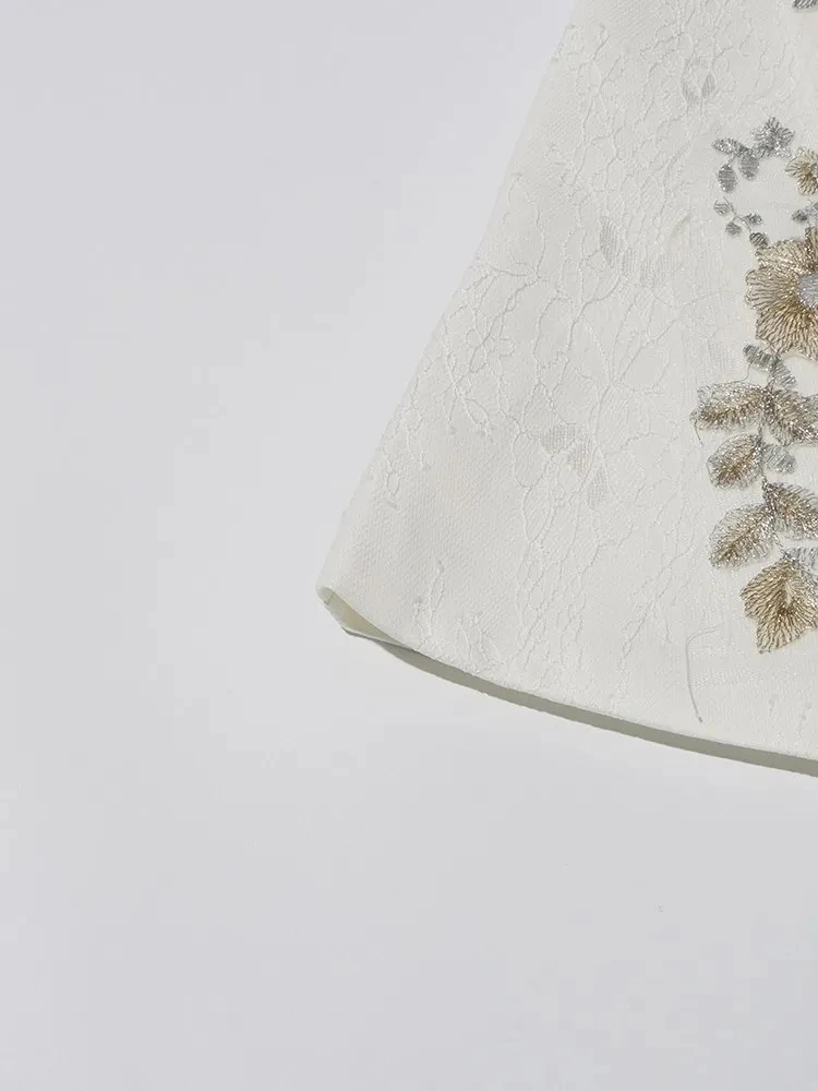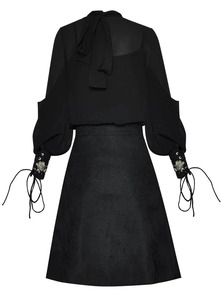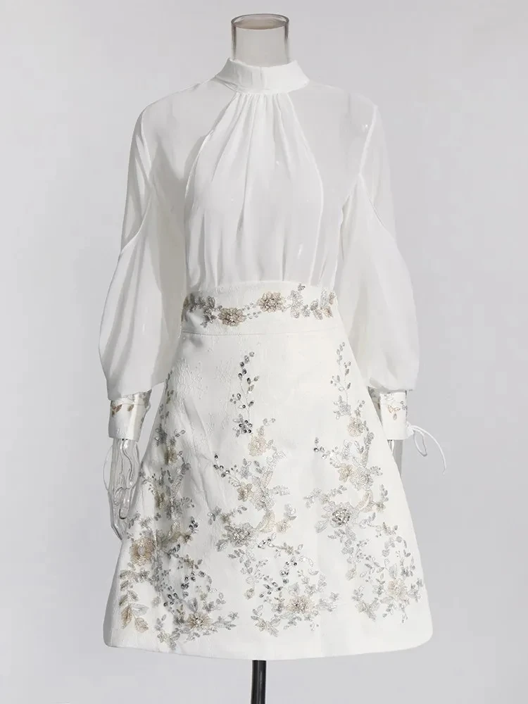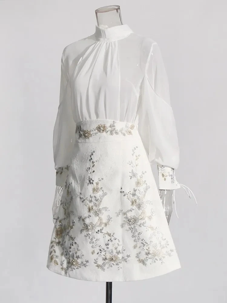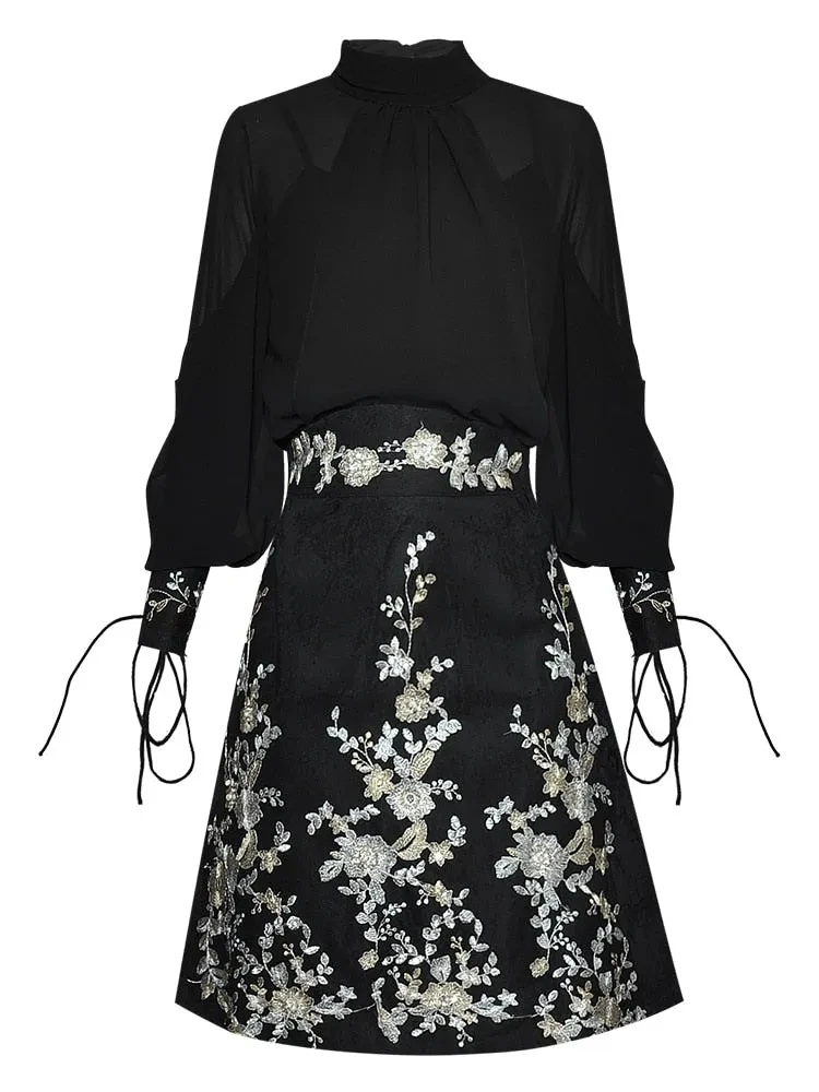 VGH Patchwork Embroidery Two Piece Set For Women Stand Collar Lantern Sleeve Tops High Waist Skirts Solid Sets Female Fashion