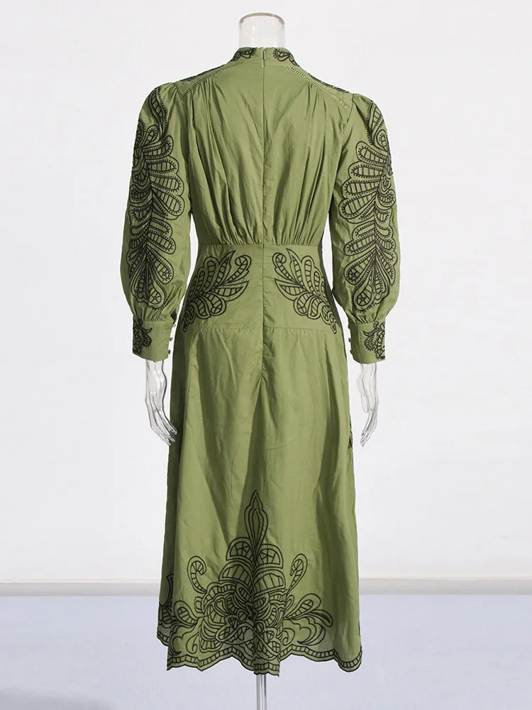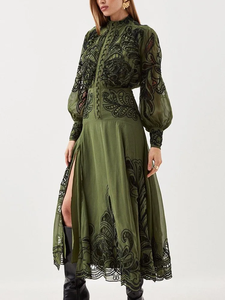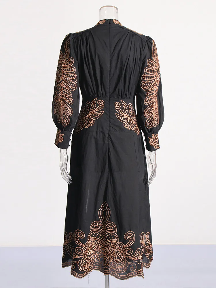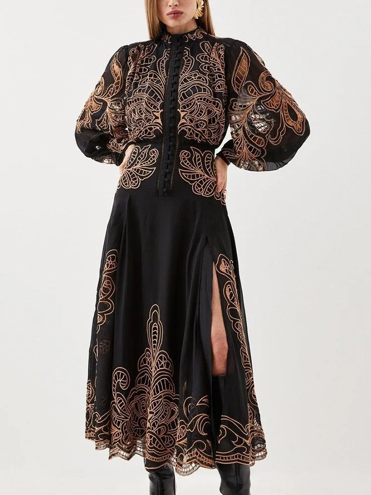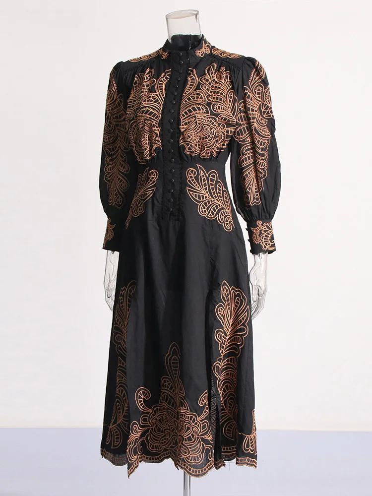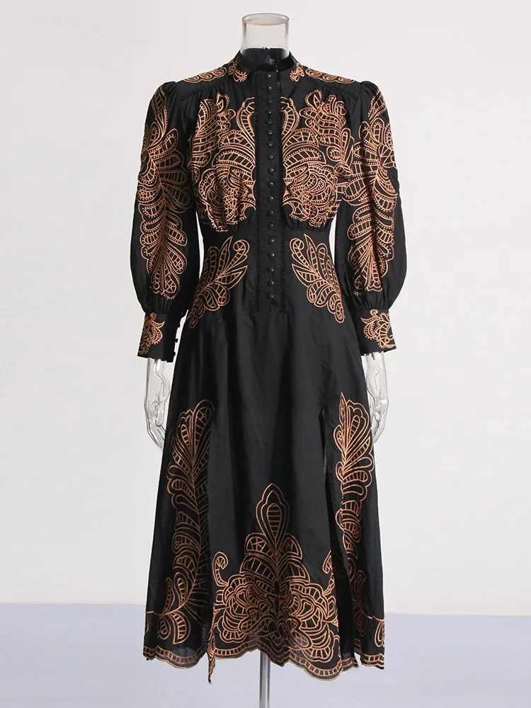 VGH Patchwork Single Breasted Split Dress For Women Stand Collar Long Sleeve Hollow Out Hit Color Long Dresses Female Fashion