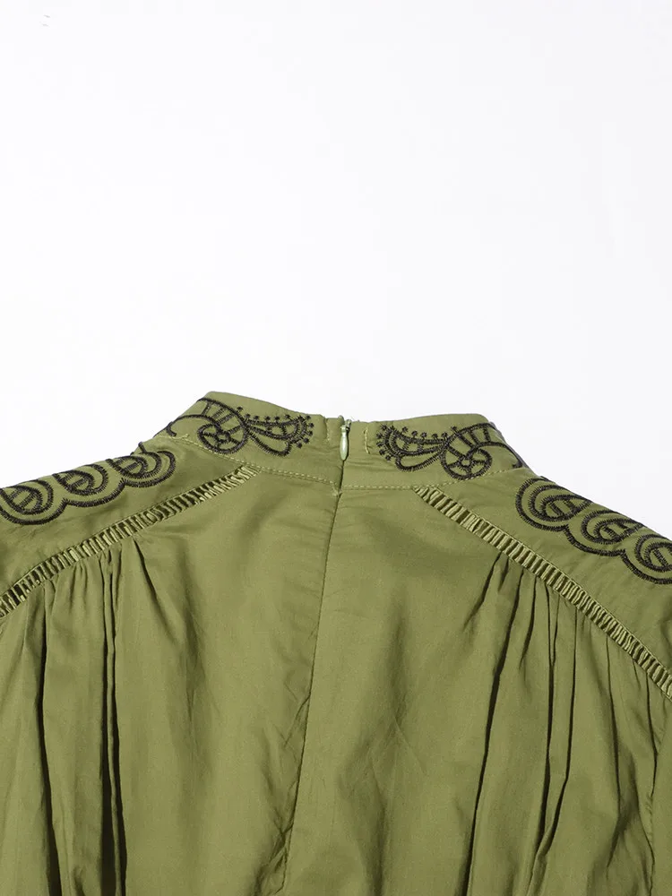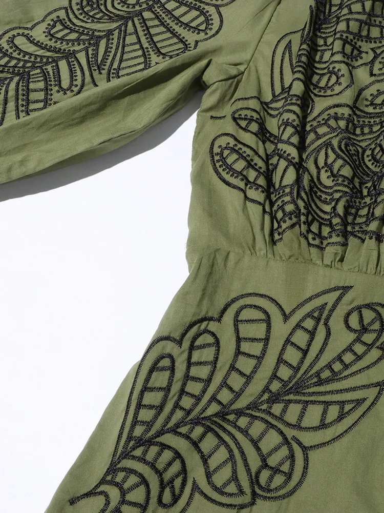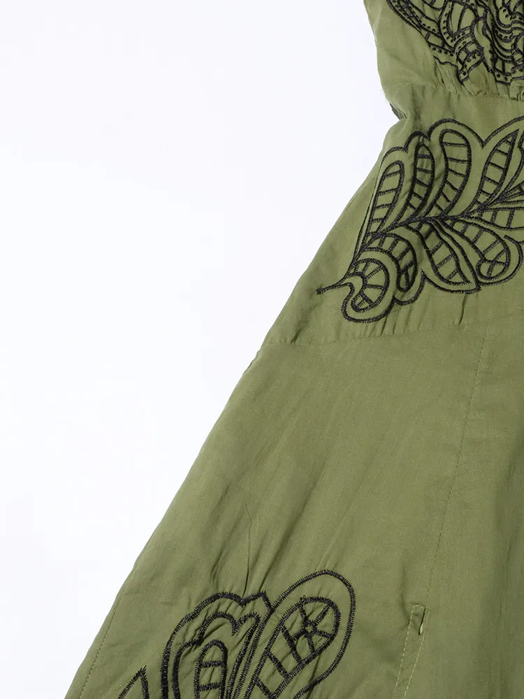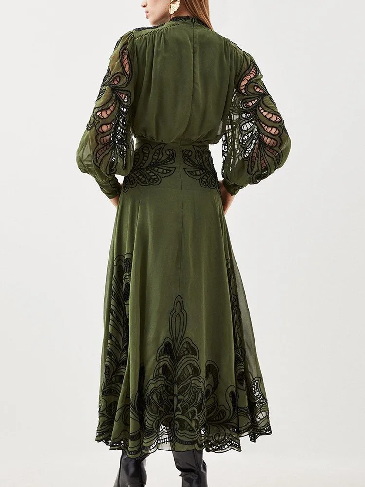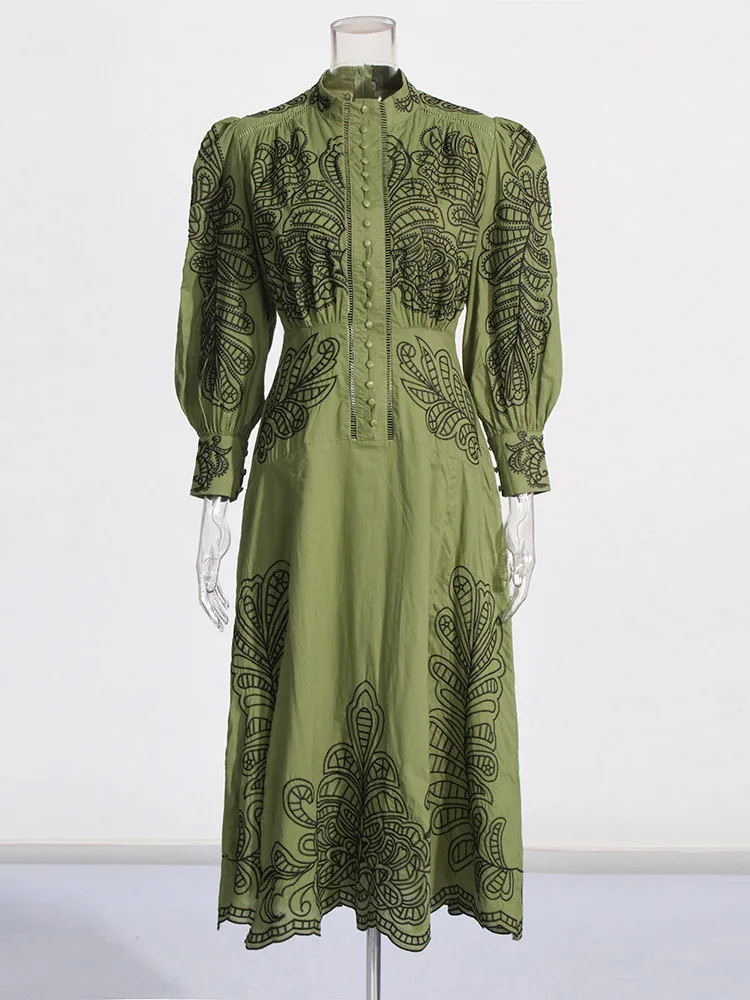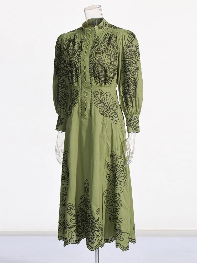 VGH Patchwork Single Breasted Split Dress For Women Stand Collar Long Sleeve Hollow Out Hit Color Long Dresses Female Fashion