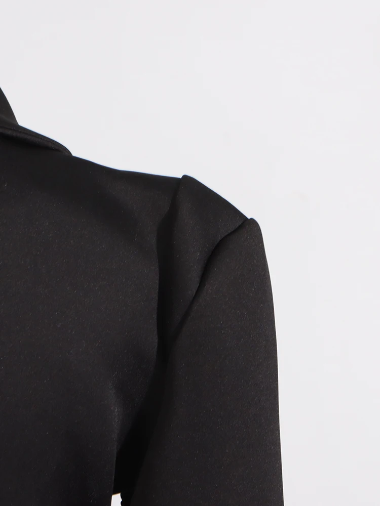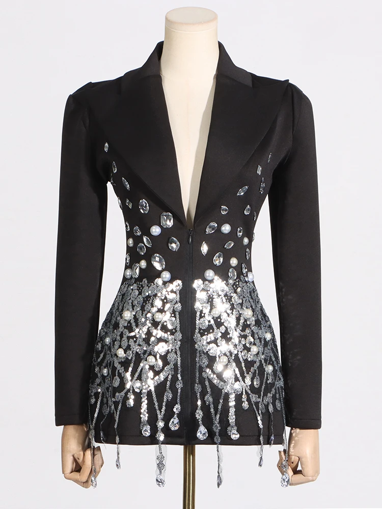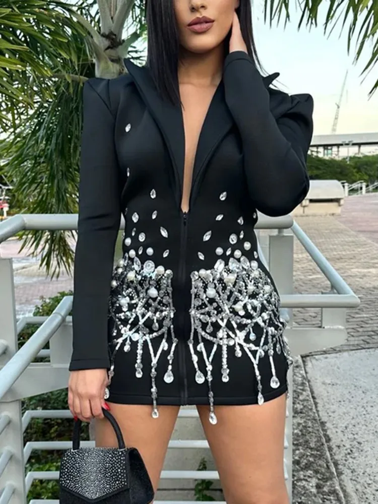 VGH Solid Patchwork Diamonds Temperament Dress For Women Notched Collar Long Sleeve High Waist Slimming Dresses Female Fashion