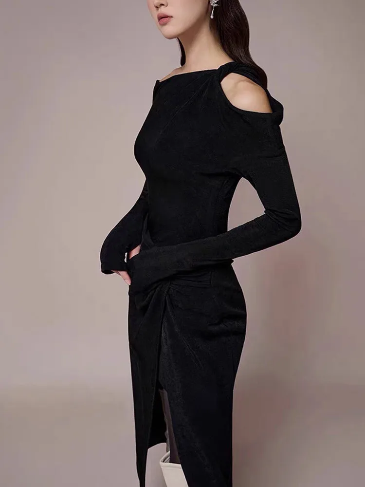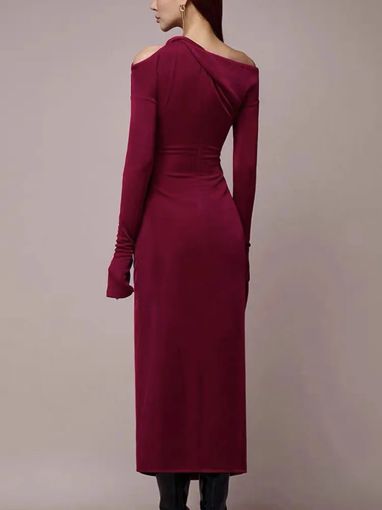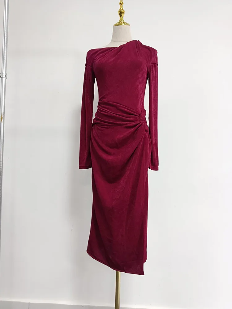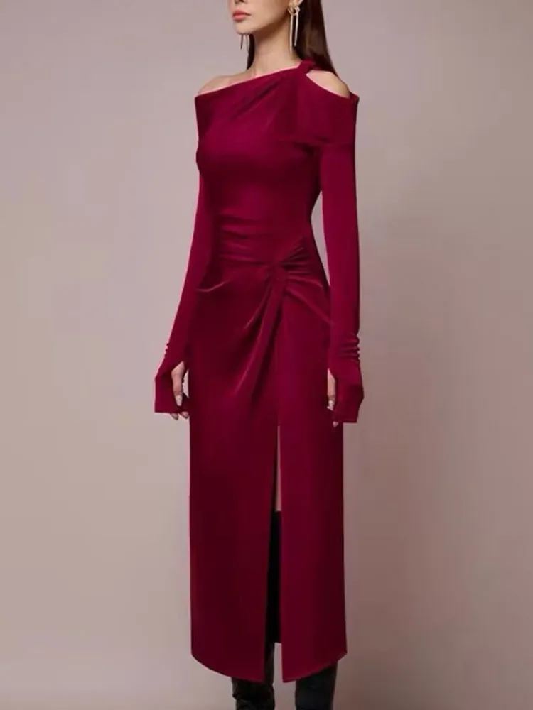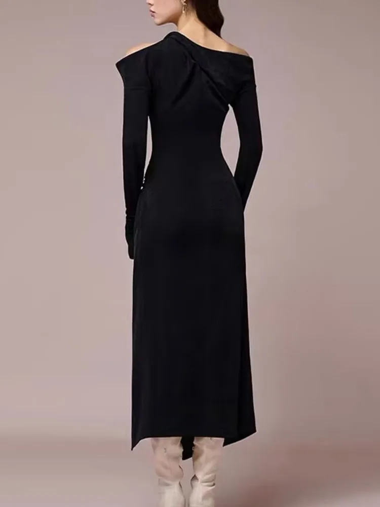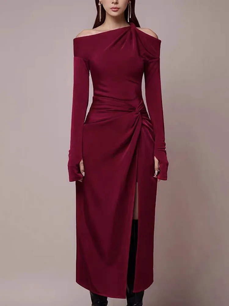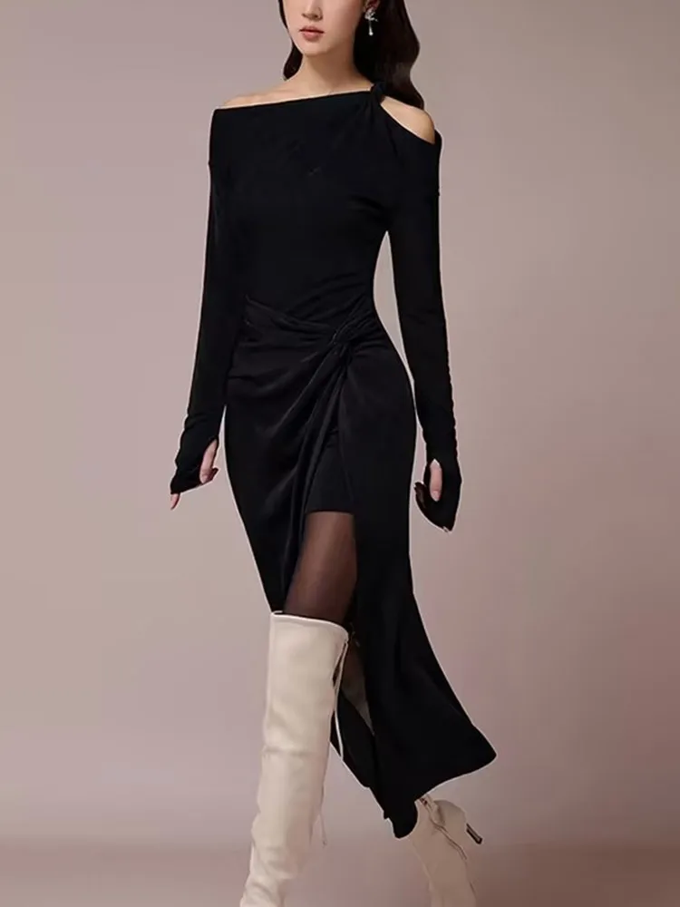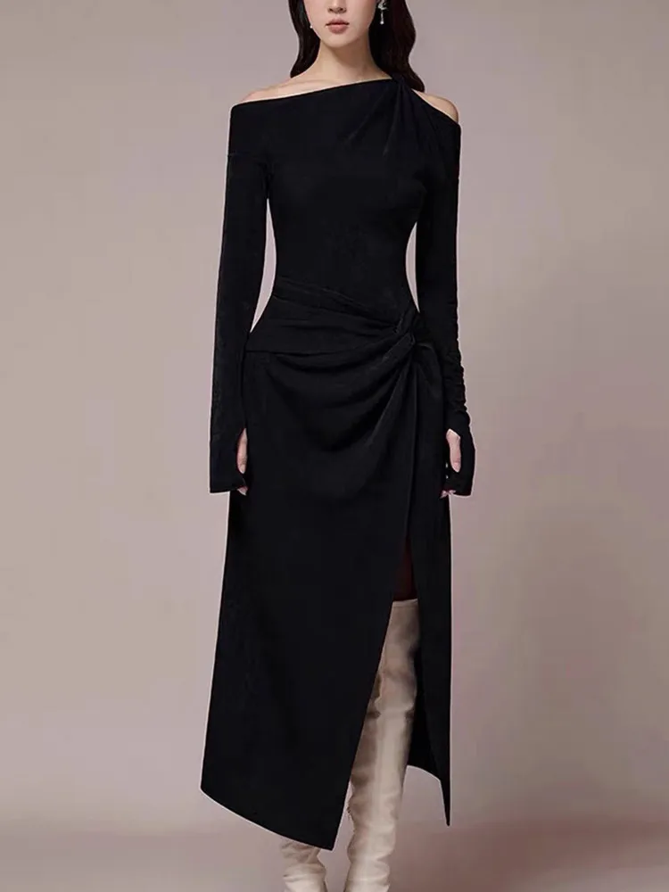 VGH Solid Patchwork Folds Elegant Dress For Women Diagonal Collar Long Sleeve High Waist Temperament Split Dresses Female New