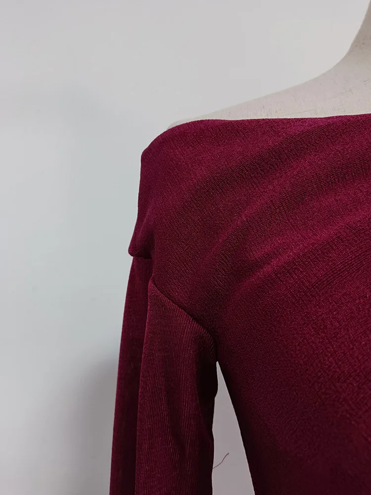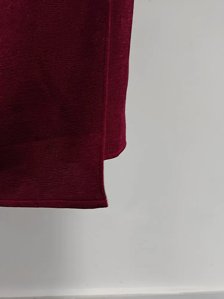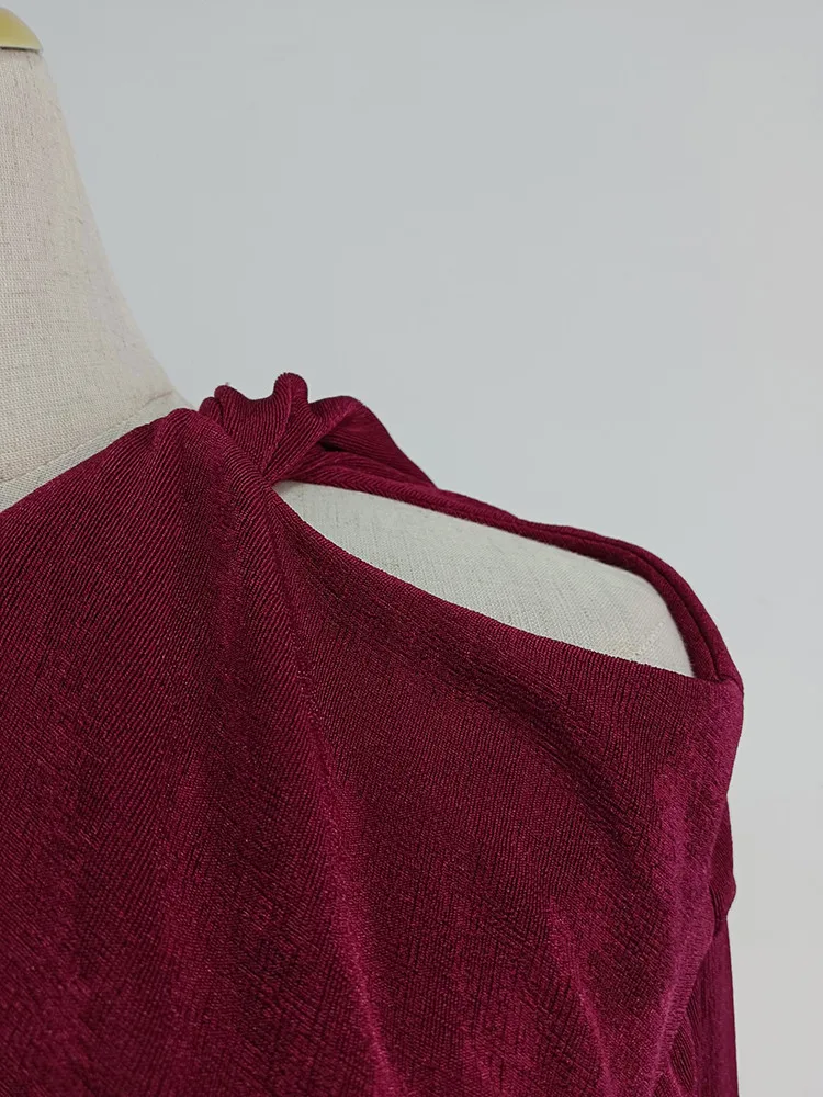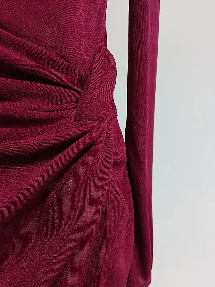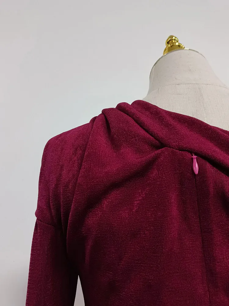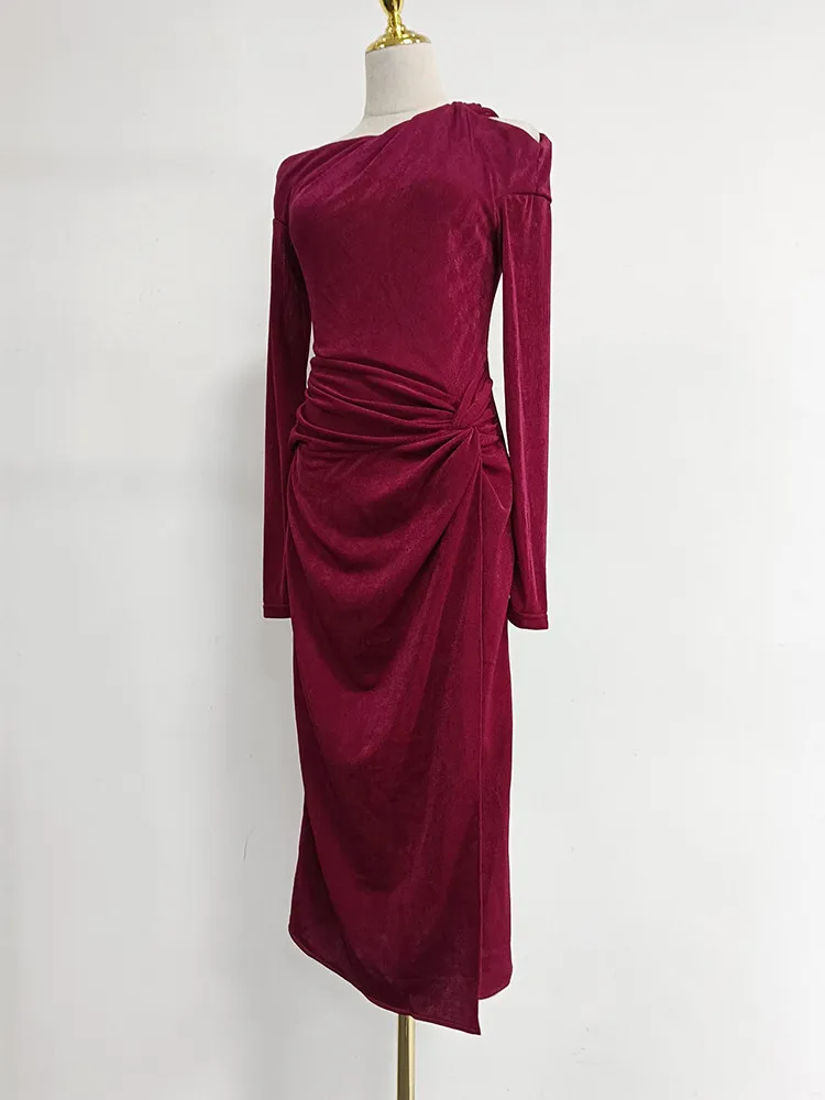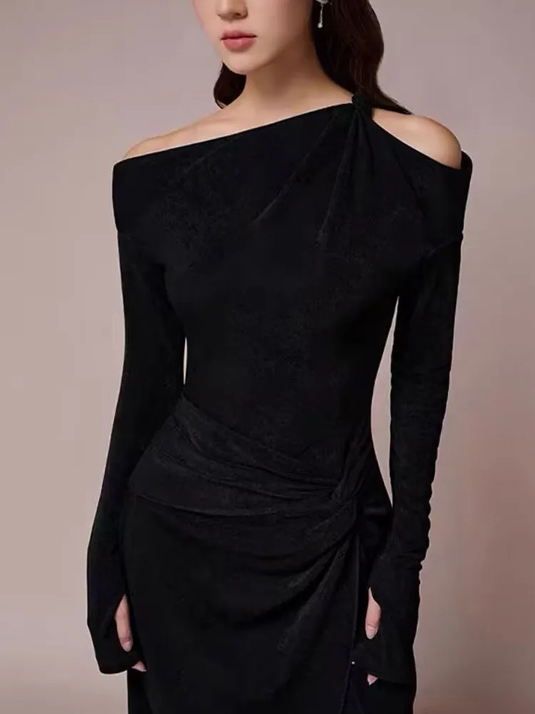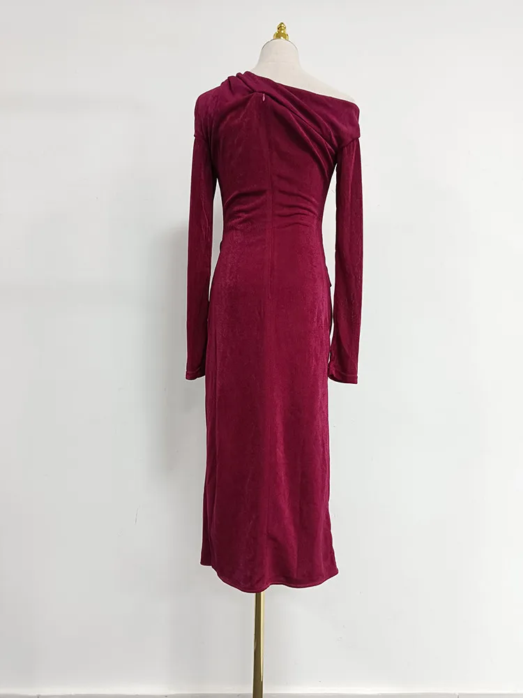 VGH Solid Patchwork Folds Elegant Dress For Women Diagonal Collar Long Sleeve High Waist Temperament Split Dresses Female New